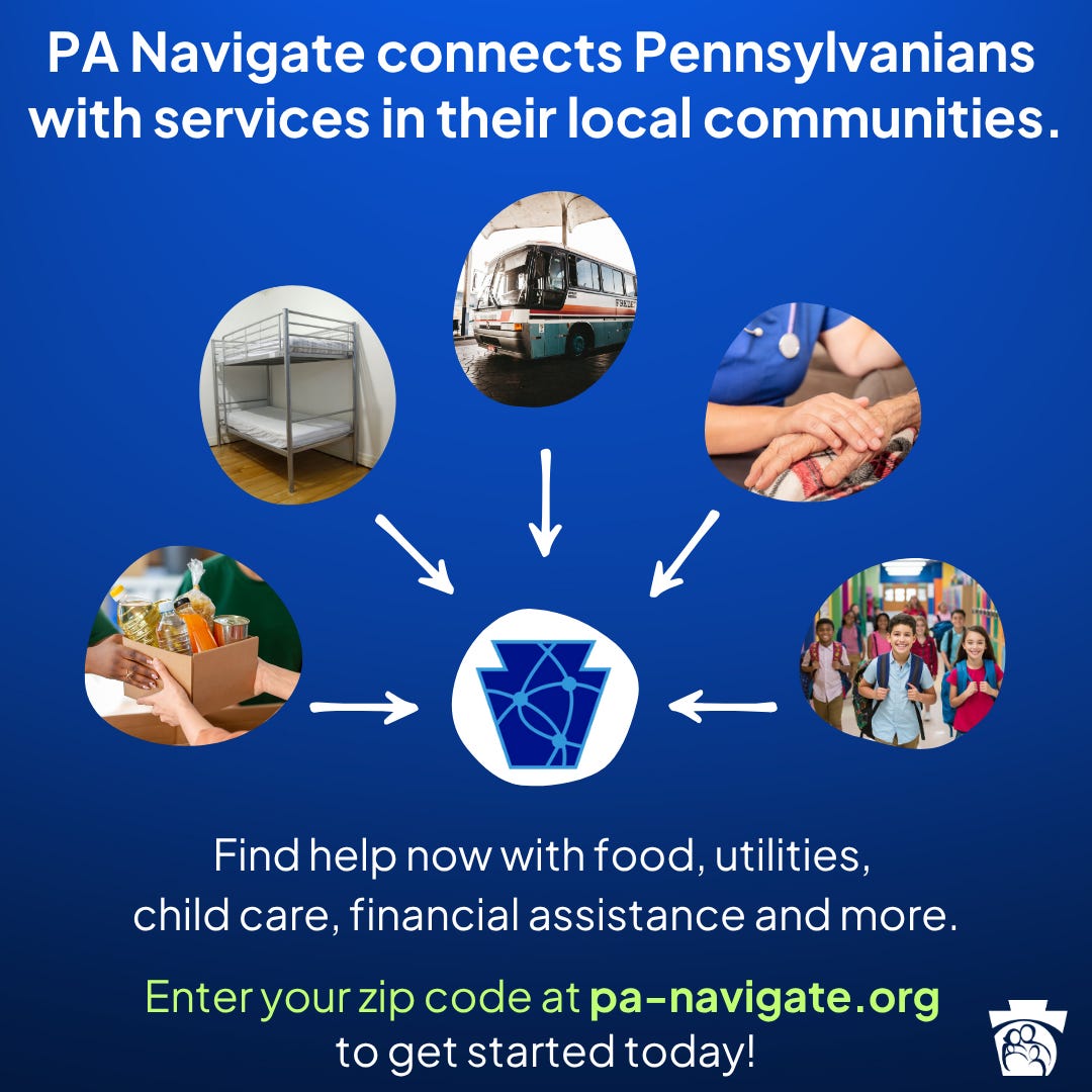 Alt Text: PA Navigate connects Pennsylvanians with services in their local communities. Find help now with food, utilities, child care, financial assistance and more. Enter your zip code at pa-navigate.org to get started today!